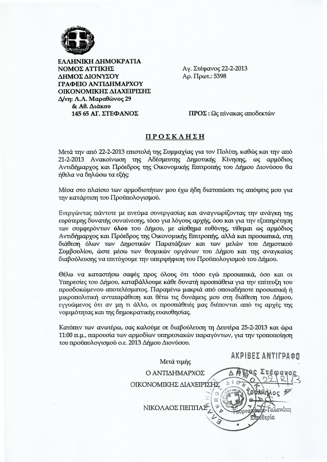 Ο Αντιδήμαρχος Οικονομικής Διαχείρισης κ. Νικόλαος Πέππας απέστειλε, μεταξύ άλλων, και στον επικεφαλής της Α.Δ.Κ. Αβραάμ Πασιπουλαρίδη την κάτωθι παρατιθέμενη υπ’ αρ. πρωτ. 5398/22-2-2013 «ΠΡΟΣΚΛΗΣΗ»: